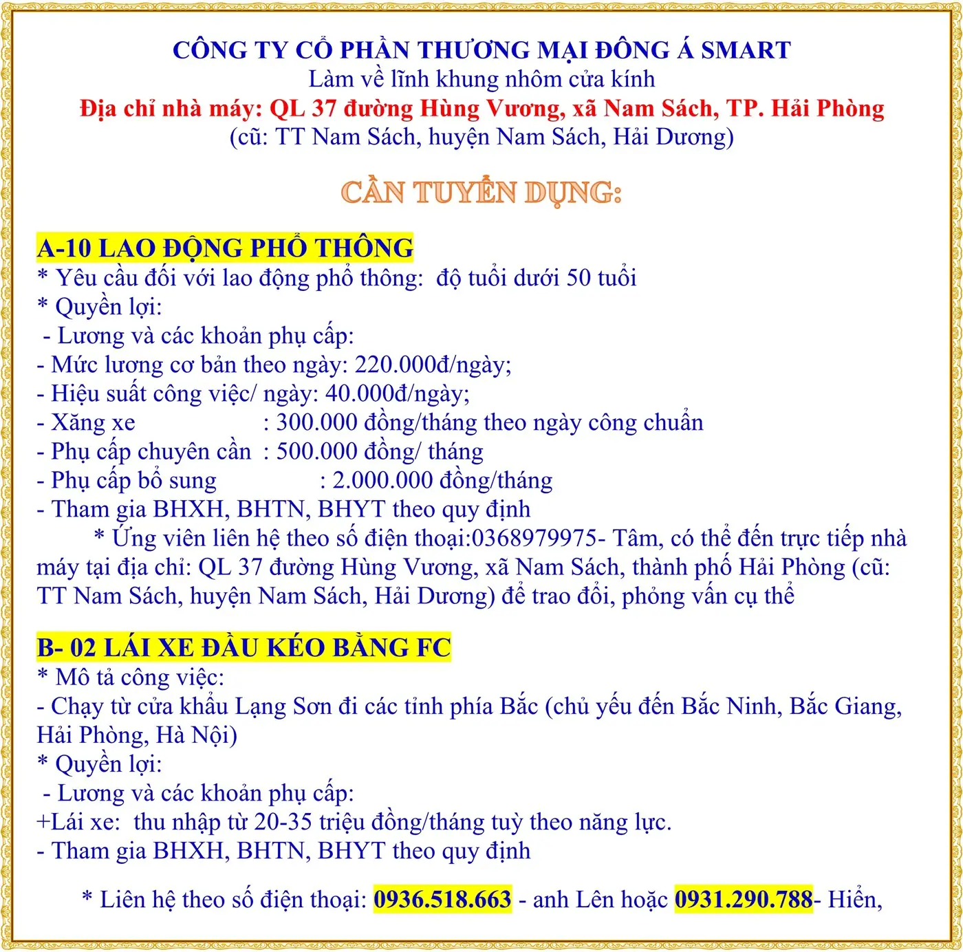 📞 Liên hệ ứng tuyển: Mrs. Nguyên: 0986 811 458 📌 Ưu tiên ứng viên liên hệ sớm – nhận việc ngay khi đạt yêu cầu