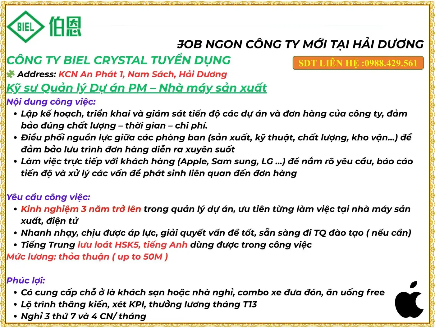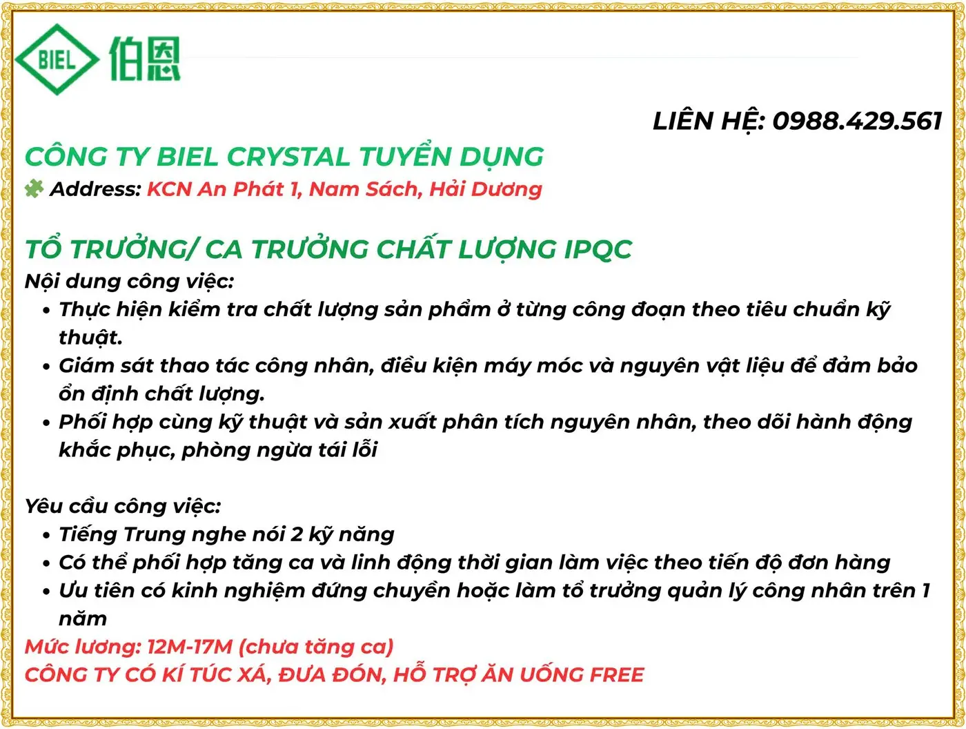 BIEL CRYSTAL HẢI DƯƠNG TUYỂN DỤNG CHO XƯỞNG MỚI – QUA TẾT NHẬN VIỆC